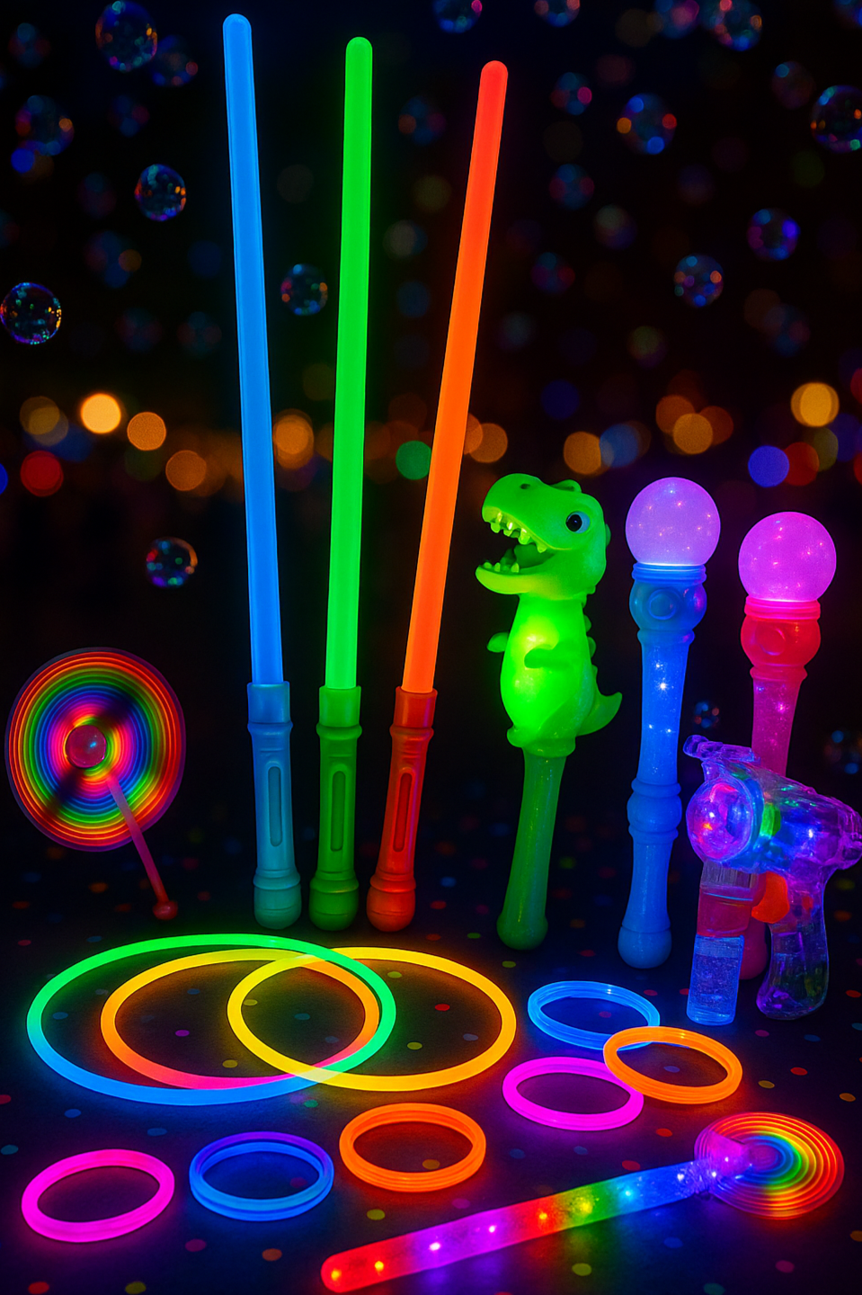 We offer a wide variety of glowing toys and accessories—from bubble wands and light-up hats to swords, spinners, and more. Our lineup is constantly evolving to match what kids love most!